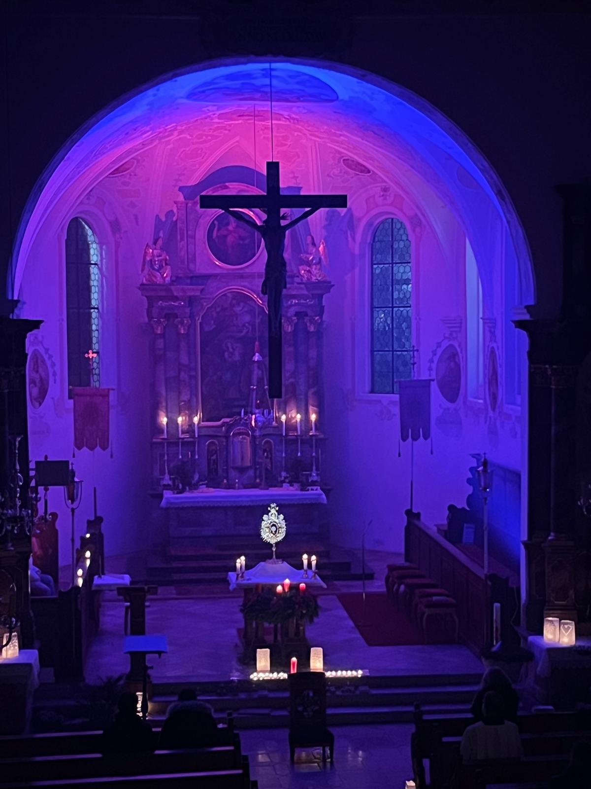 Genau fünf Tage vor Heiligabend, am Freitag dem 19.12.2025, fand in der Pfarrkirche St.Georg in Aislingen der Abend der Versöhnung statt. Schon beim Betreten der Pfarrkirche richteten sich die Blicke auf den besonders beleuchteten Altarraum, der eine ganz eigene Wirkung entfaltete. Die besinnlich gestimmte Atmosphäre wurde vom Chor Cantare einfühlsam durch Gesänge ergänzt.