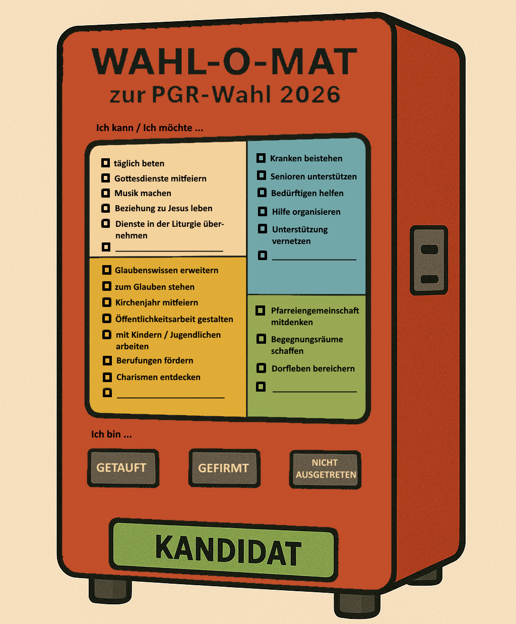"Wahl-O-Mat" - so funktioniert er: Nehmen Sie sich ein paar Minuten Zeit! Lesen Sie die Stichpunkte in den farbig hinterlegten Feldern durch und denken Sie darüber nach. Wenn eine Tätigkeit oder ein Anliegen zu Ihnen passt, kreuzen Sie es - im Geiste - an. Vielleicht haben Sie auch eine eigene Ergänzung für den jeweiligen Bereich? Dafür kann die leere Zeile in jedem Feld stehen. Wenn am Ende in jedem der vier Felder jeweils zwei Kreuzchen stehen, sowie die drei Punkte unter „Ich bin…“ für Sie zutreffen, dann sind Sie zweifellos für den Pfarrgemeinderat Ihrer Pfarrei geeignet. Wir brauchen SIE dringend und würden uns freuen, Sie im Gremium willkommen heißen zu dürfen! Sprechen Sie uns einfach an.